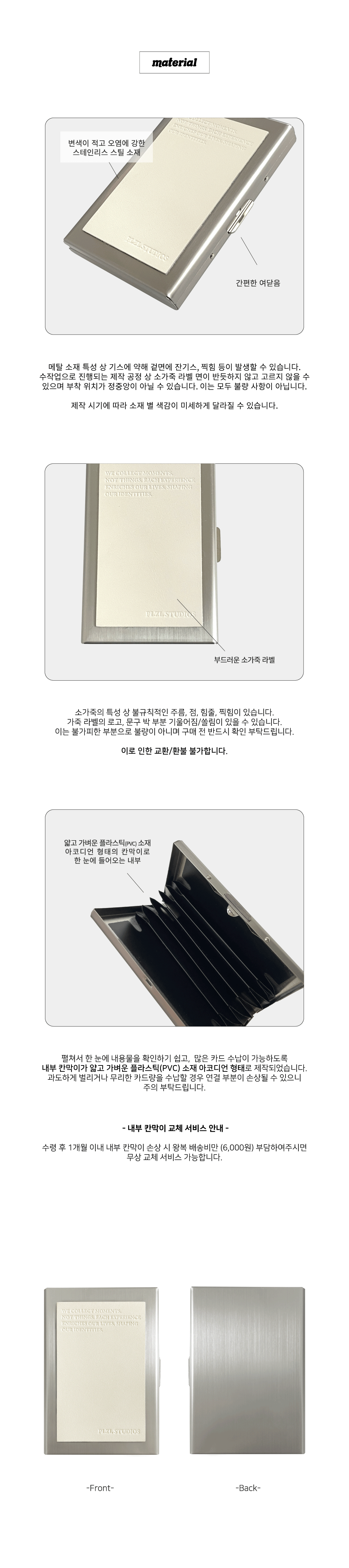 - 제품 특성상 단순 변심, 부주의에 의한 제품 손상 및 파손, 사용 및 개봉한 경우 교환/반품이 불가합니다.